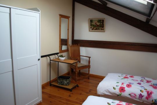 Standard room la Forêt approximately 18 m². Room on a first floor under a sloping (high) roof with a large Velux skylight. Washbasin, kettle, wardrobe and fan. This room has two double beds 80x200 cm as standard, but a single bed can be added on request. Private toilet and shower are right next to the room on the landing. The room is also rented in combination with room Astre for travelling groups needing 2 rooms or up to 6 people seeking overnight accommodation. In that case, it becomes the Étage (floor) for families.